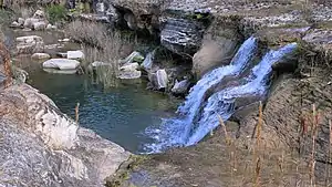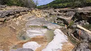 Canyon Lake Gorge is a limestone gorge in Texas, which is around 1 mile (1.6 km) long, hundreds of yards (metres) wide, and up to 50 feet (15 m) or more deep, which was exposed in 2002 when extensive flooding of the Guadalupe River led to a huge amount of water going over the spillway from Canyon Lake reservoir and removing the sediment from the gorge. The gorge provides a valuable exposure of rock strata as old as 111 million years showing fossils and a set of dinosaur tracks, and forms a new ecosystem for wildlife with carp and other creatures in a series of pools fed by springs and waterfalls.[1]