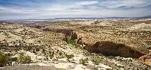 The Canyons of the Escalante is a collective name for the erosional landforms created by the Escalante River and its tributariesthe Escalante River Basin. Located in southern Utah in the western United States, these sandstone features include high vertical canyon walls, numerous slot canyons, waterpockets (sandstone depressions containing temporary rainwater deposits), domes, hoodoos, natural arches and bridges. This areaextending over 1,500 square miles (3,885 km2) and rising in elevation from 3,600 ft (1,097 m) to over 11,000 ft (3,353 m)is one of the three main sections of the Grand Staircase–Escalante National Monument, and also a part of the Glen Canyon National Recreation Area, with Capitol Reef National Park being adjacent to the east.