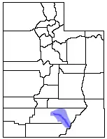 The headwaters of the Escalante River are located on the slopes of the Aquarius Plateau, in Utah's Garfield County, just west of the town of Escalante. The Escalante River begins at the confluence of Birch Creek and North Creek,[1] with the flow of Pine Creek added just below the town.[2] The river runs a total distance of 80 mi (130 km) from the Birch/North Creek confluence before emptying into the Colorado River in Kane County.[3] The lower section of the river, southeast of Coyote Gulch, is now beneath the surface of Lake Powell.