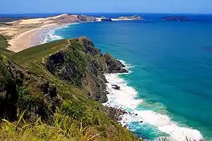 Cape Maria van Diemen is the westernmost point of the North Island of New Zealand. A tombolo, it was originally an island composed mainly of basaltic-andesitic lava flows and dykes.[1] Drifting sands joined it to the rest of the North Island during the late Pleistocene.