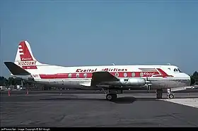 The four engine Viscount V.745 British medium-range turboprop airliner, serial number 108, first flew from Hampshire, England on 6 January, 1956. Powered by Rolls-Royce Dart RDa3 Mark 506 engines turning four blade square tipped constant-speed propellers, it was delivered to Capital Airlines on 15 January, 1956 as fleet number 329.[2]