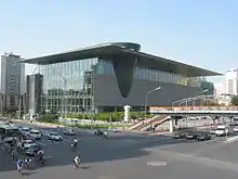 The Capital Museum's massive roof and the gradient at the entrance square is the work of architects Jean-Marie Duthilleul and Cui Kai. It was influenced by ancient Chinese architecture,[4] and the stone-made exterior wall was meant to symbolize the city walls and towers of ancient China.[4] A piece of danbi (a massive stone carved with images of dragon, phoenix and imperial artifacts) is embedded on the ground in front of the north gate of the museum. A decorative archway from the Ming Dynasty, set in the reception hall, shows the "central axis" feature that is commonly seen in Chinese architecture.[4] The Bronze Exhibition Hall, which has an oval-shape, was meant to symbolize the unearthing of ancient relics by its slanting design which extends from the ground to the exterior of the museum.[4]