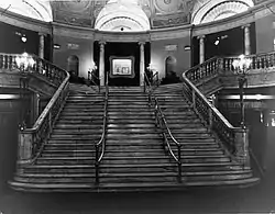 Ottawa's Loews theater was different, as it occupied the entirety of a prime downtown corner site. This enabled Lamb to design a grander lobby for the theater, with a majestic marble staircase and balustrade, a colonnaded mezzanine, and a domed ceiling with a great crystal chandelier. The auditorium was equally impressive, with its ornate proscenium arch, hand-painted ceiling dome, box seats, and balcony. The Capitol was considered to be among the finest movie palaces in North America. In Palaces of the Night, John Lindsay wrote: "many feel the Ottawa Capitol was the most attractive of all of Lamb's theatres", with "the grandest split staircase and lobby anywhere".[4][5][6][7]