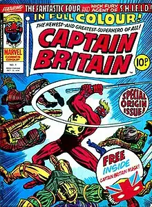 Marvel UK had been established in 1972. In order to fit in with the style of British weeklies, titles such as The Mighty World of Marvel consisted of reprinted Marvel material in an anthology magazine format, with much of the colour removed. However, these failed to make a major impression on the market, which was dominated by titles of original British material from Fleetway Publications and DC Thomson.[1] In response, Marvel decided the line needed a British character as a flagship title. As Marvel UK itself was effectively a packaging operation at the time with no experienced creative staff[2] the character was devised at Marvel's American headquarters. London-born[2] Chris Claremont - at the time a rising star in the company following his successful work on the revival of X-Men - was one of the few Anglophiles on staff,[3] and was assigned to the title. He came up with the name, origin and cast for the new title, Captain Britain. Art duties went to experienced Incredible Hulk artist Herb Trimpe, who lived in Cornwall at the time[2] and would recall the 8-page strips typically only took him a couple of days to draw.[1] The designer of the character's patriotic costume, complete with Heraldic lion rampant, is unknown; Trimpe has speculated it was John Romita.[1] The character's origin tied into British Arthurian myths, seeing 'Thames University' science student and part-time laboratory assistant Brian Braddock granted the powers and identity of Captain Britain by Merlyn and his daughter Roma after a motorcycle accident on Darkmoor. The latter was inspired by Dartmoor, site of a fact-finding vacation for Claremont and Trimpe.[4] The new character debuted in Captain Britain #1.[5] After the first two issues covering Braddock's origin, Captain Britain #3 introduced the initial supporting cast - love interest Courtney Ross; campus bully Jacko Tanner; and Inspector Dai Thomas, a Scotland Yard CID officer with a deep hatred of superheroes who continually tried to expose Captain Britain as a menace and discover his secret identity, and who was often gently undermined by more reasonable subordinate Kate Fraser.[1] Claremont would later note the set-up was deliberately reminiscent of Spider-Man, considering the format to be "intro to Marvel 101".[6]