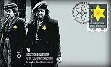 The photograph is known as a famous representation[16] of the Warsaw Ghetto uprising and of Jewish resistance during the Holocaust. The photograph was used for the first day of issue cover for a Polish stamp commemorating the seventieth anniversary of the Warsaw Ghetto Uprising. The original cover was controversial, since the graphic designer added yellow badges to the left lapels of the women. In fact, Jews in the Warsaw Ghetto were forced to wear blue Stars of David on white armbands, and the combatants discarded their armbands because they considered them humiliating symbols of Nazi oppression. Because of the lack of historical accuracy, some people objected to the cover.[17] The cover was reissued without the Star of David badges.[18][19]