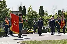 The search and reburial of fallen soldiers at the complex is ongoing. On 21 March 2010, the search squad "Russian Historical and Patriotic Club" buried 14 fighters of the Red Army.[7] On Victory Day (9 May) in 2018, members of the Party of Socialists of the Republic of Moldova participated in a solemn burial ceremony of the bones of 26 soldiers in a ceremony was organized by the National Committee "Victory", under the auspices of the President of Moldova. The ceremony was attended by the Ambassador of Russia.[8] On the operation's diamond jubilee (75th anniversary) in 2019, a ceremony which was attended by Russian Defence Minister Sergey Shoigu, President Igor Dodon, and Moldovan Defence Minister Pavel Voicu was held at the complex.[9][10][11] During the national ceremony, Shoigu ceremonially handed to Voicu the military flags of two all-Moldovan regiments who participated in the offensive, which until that point, were kept at the Central Armed Forces Museum in Moscow.[12] 45 burials were held on the 75th anniversary in 2020.[13]