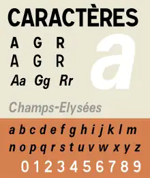 Caractères (Characters) is a name of a sans-serif typeface family for road signs in France including its overseas territories, as well as Monaco, Luxembourg, and Francophone countries in Africa, and formerly in Spain and Portugal. There are four variants: L1, L2, L4 and L5. Caractères L1 is the bold variant, usually a black typeface on white background; used on road signs, which indicate places nearby, and uppercase only. L2 is the medium variant which is a white typeface on green background for Routes Nationales or blue backgrounds for Autoroutes; used on road signs which indicate distant places, and also uppercase only. L4 is the italic variant, which is like the L1 variant, is also a black typeface on white background, used on road signs within a city to indicate nearby places and public facilities, in both uppercase and lowercase. L5 is an upright companion to the L4 font, used for historical monuments and other places of interest.