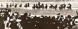 Carbine, nicknamed "Old Jack", was undefeated in five starts in top-class races as a two-year-old in New Zealand. He then was taken to Australia, where he won nine of 13 starts as a three-year-old.[5] One highlight that year was his win in the AJC Sydney Cup of 2 miles (3,220 metres) carrying 12 lb (5.5 kg) over weight-for-age. Despite suffering interference at the half-mile post and being buffeted back to last place, Carbine won by a head in a record time of 3 min 31 s. (Race times were slower in Carbine's era than now due, among other factors, to the rough state of tracks and the upright posture in the saddle assumed by 19th-century jockeys.) At the end of his three-year-old racing season, Carbine was sold by his owner-trainer Dan O'Brien for 3,000 guineas and prepared by his new owners for racing in Sydney and Melbourne.[6]