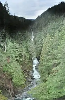Having run generally northwest, the Carbon River turns more directly west until it is joined by Evans Creek just before the small settlement of Fairfax. From Fairfax to Carbonado the Carbon River flows north through a narrow gorge, with Gleason Hill to the east and Wingate Hill to the west.