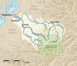 Below Crocker the Carbon River flows northwest to join the Puyallup River. The city of Orting is located at the confluence, in the floodplain between the Carbon and Puyallup rivers.[5]
