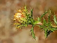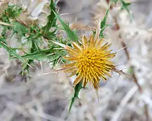 The yellow flowers are terminal, 2.0–3.5 cm (0.8–1.4 in) in diameter and surrounded by thorny bracts. The outer bracts are similar to leaves, while the inner bracts surrounding the disk florets are membranous and stiff, with a golden color. The flowering period extends from June through August. The flowers are hermaphrodite and are pollinated by insects (usually bees, wasps and butterflies) (entomogamy). The fruits are achenes 2.5 millimetres (0.1 in) long, each with a feathery yellow pappus. Seed dispersal is by wind (anemochory).[4]