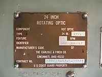 Distinct from searchlights, Carlisle & Finch also produced rotating beacons in the DCB (Directional Code Beacon) series starting around 1950.[19] These project a narrow light beam. The light rotates, causing it to appear to flash from the viewpoint of a distant observer. These were originally used as aerodrome beacons, but in the 1990s, the U.S. Coast Guard adopted them for use in lighthouses, replacing existing Fresnel lenses. Models included DCB-24 with a 24-inch (61 cm) diameter, DCB-224 with two such lights, and DCB-36 with a 36-inch (91 cm) diameter.[20]