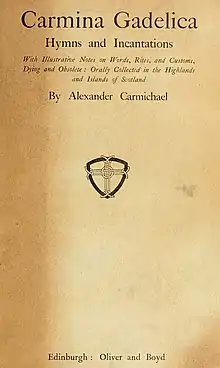 Carmina Gadelica was published in six volumes: Alexander Carmichael himself, with the assistance of family and friends, was responsible for the first two volumes, published in 1900; these were re-edited by his daughter Ella (1870–1928) in 1928. Although Carmichael's correspondence suggests that he planned at least one further volume in the series, he was unable to bring this plan to fruition. Further selections from Carmichael's manuscripts were edited by his grandson James Carmichael Watson (1910–1942) and published as volumes III (1940) and IV (1941). A fifth volume, mostly taken up with song texts, was edited by Professor Angus Matheson (1912–1962) in 1954. The series was rounded off in 1971 with a sixth volume containing a lengthy glossary and indices, edited by Angus Matheson with the assistance of his brother William (1910–1995).[1] In 1992 Floris Press published a one-volume English-language edition with a valuable introduction by Dr John MacInnes (b. 1930).[2] Floris Press reprinted the entire six-volume series in 2006.[3]