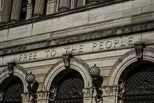Andrew Carnegie donated the library and the buildings. With the goal of inspiring people to do good for themselves and their communities, the terms for donations required communities to support them in exchange for the building and initial investment by Carnegie. The words "free to the people" inscribed above the entrance of the Carnegie Library of Pittsburgh illustrate his vision.[4] The other two museums, The Andy Warhol Museum and the Carnegie Science Center, are located in separate facilities on Pittsburgh's North Shore.[5]