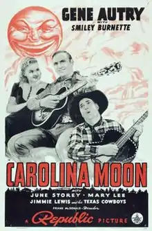 Carolina Moon is a 1940 American Western film directed by Frank McDonald and starring Gene Autry, Smiley Burnette, and June Storey.[1] Based on a story by Connie Lee, the film is about a singing cowboy who comes to the aid of plantation owners who are being robbed of their land by a scheming lumber company.[2]