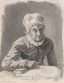 Caroline Lucretia Herschel was born in the town of Hanover Germany on 16 March 1750. She was the eighth child and fourth daughter of Isaak Herschel (1707–1767), a self-taught oboist, and his wife, Anna Ilse Moritzen (1710–1792). The Herschel family originated from Pirna in Saxony near Dresden. Issak became a bandmaster in the Hanoverian Foot Guards, whom he first joined in 1731, and was away with his regiment for substantial periods. He became ill after the Battle of Dettingen (part of the War of the Austrian Succession) in 1743 and never recovered fully; he suffered a weak constitution, chronic pain, and asthma for the remainder of his life.[8][9][10] The oldest of their daughters, Sophia, was sixteen years older, and the only surviving girl besides Caroline. She married when Caroline was five, meaning that the younger girl was tasked with much of the household drudgery.[11] Caroline and the other children received a cursory education, learning to read and write and little more. Her father attempted to educate her at home, but his efforts were mostly successful with the boys.[10]
