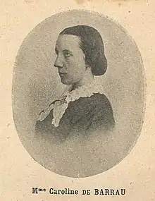 Caroline de Barrau (1828–88) was a wealthy French educationalist, feminist, author and philanthropist. She became interested in the education of girls, created a school in Paris where her daughter was taught, and encouraged her daughter and other young women to successfully apply for admission to the University of Paris, previously a male-only institution. She belonged to international feminist associations, investigated the conditions of working women in Paris, was a leader in the campaign to eliminate state-regulated prostitution, helped prostitutes reenter society after being released from prison and provided aid to abandoned infants. She was the author of several books on women's issues.