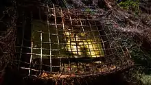 A process had been discovered in the 1770s whereby lead could be extracted from the fumes emitted by reverberatory furnaces if the vapours could be trapped long enough to precipitate the lead.[7] To this end a flue 1+1⁄4 miles (2.01 kilometres) long running from the lead works and terminating at a chimney near the summit of Carrickgollogan was constructed in 1836.[6][7] The distinctive granite flue chimney with its external spiral staircase and viewing platform quickly became a noted landmark and was marked on Admiralty charts as a point of reference for mariners.[6] Photographic records show that the flue chimney was originally much taller with an extra brick section, now dismantled, rising above the viewing platform.[6] It is the only example of such a flue and chimney to have been built in Ireland.[7] Weston St. John Joyce noted that the flue was "stated to be one of the best constructed in the United Kingdom".[8] The precipitated lead deposits were scraped out of the flue by hand and many of the workers subsequently died of lead poisoning, giving the surrounding area the nickname "Death Valley".[9]