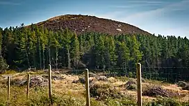 The geological composition of the summit is predominantly quartzite.[4] The high ground is a mixture of heathland and commercial forestry while the lower slopes are mainly farmland.[4] The forest on the mountain is mixed woodland including Lodgepole pine, Noble fir, Japanese larch, Lawson cypress, Scots pine, birch and beech trees and is a habitat for badgers, rabbits and a variety of birds.[3] The area around the summit includes a number of sites of historical interest including the former lead works at Ballycorus and the ruined church and round tower at Rathmichael.