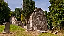 All that remains of the church is the east gable of a thirteenth-century chancel and the south wall of a twelfth-century nave.[18] The church has lain in ruins since the end of the seventeenth century.[13] It is noted for its collection of grave slabs or leacs known as the Rathdown stones, nine examples of which can be found at the old church in Rathmichael attached to the south wall.[20] Thirty-two examples of these slabs are known around the Rathdown area and are found nowhere else in Ireland.[21] No two stones are the same but share similar types of decoration in the form of concentric circles, cup marks and herring-bone patterns.[13] It was once thought that these slabs dated to pre-Christian times but subsequent research has shown them to have been influenced by Norsemen art styles and they are now believed to be gravemarkers of Norsemen Christians.[22]