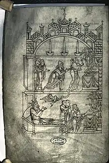 The original cartulary of the manuscript, dated to the middle of the 12th century, is decorated with several ornate initials: they are placed at the beginning of each charter. The letters are very little varied, as it is most often an "I" or "L", but each letter has a different decoration. The initials of the oldest part are black in colour, and contain fantastic animals mixed with interlacing: unicorns, billy goats, owls and werewolves, inspired by Physiologus or by folklore. Other initials are blue or red.[5] The manuscript also contains four miniatures covering all or most of their page:[6]