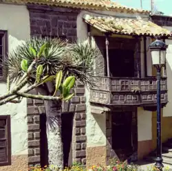 Other locations of the inferior plants are the cellars and the old stable. The most characteristic architectural elements are located in the main façade, such as the portal framed by stonework that presents a chiaroscuro known as cushioning. This frame is of a frequent typology in different points of Gran Canaria. More precisely it displays a form in which the main door is united with a window of the superior plant that is decorated as well with the corresponding sill and the cornice that crowns the whole.[5]