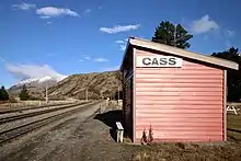It is named for Thomas Cass, an important pioneer surveyor in the area.[2] State Highway 73 passes near the town, and the Midland Line between Christchurch and the West Coast was opened to the town in 1910, with the full line opened in 1923 when the Otira Tunnel was completed. Since November 1987, the world-famous TranzAlpine passenger train has run through the town. There are 5 houses in Cass today, but only one resident (currently Barrie Drummond),[3][4] making it one of the few places in the world with a population of one resident.[5] The Cass Trust Hotel and Tavern Still Operates in the Old Ministry of Works Shed. Cass is home to the large civil contracting company, Cass Contracting which employs over 170 highly skilled staff.