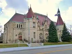 The Castle Museum was designed by William Martin Aiken, the Supervising Architect of the US Treasury, and built in 1898 as a United States Post Office under a federal building program to reflect the ethnic and cultural heritage of its community.[1] Aiken used the influence of the European chateau to illustrate the Saginaw Valley's earliest white settlers—French fur traders and trappers—and combine it with decorations from the Italian Renaissance and Gothic periods.[2] The Castle Building was on the verge of extinction in the 1930s. Unable to keep up with Saginaw's growing mail business, the Castle Post Office Station was too small and plans were made to replace it.[3] A decision was made to tear it down and build a new post office on its site. A storm of protests and a petition signed by 1,000 residents was sent to Washington. The signers of the petition called the building “one of the best and most attractive buildings in Michigan” the replacement order was canceled in 1933.[4] A final decision to demolish was made in February 1935 more protests followed and a compromise was made on February 17, 1935 the building would be extensively remodeled. The building was remodeled by local architect Carl Macomber, who enlarged the building by adding wings on both ends using limestone from the same quarry as the original building, tore down one of the three turrets, and added a large sorting room on the back of the building by Hoyt Library. Construction was completed in 1937 and Postmaster General James A. Farley labeled the building “memorial to President Roosevelt”.[5][4] In the 1970s, a new post office was built and the building was almost demolished once again, but local citizens and the Saginaw County Board of Commissioners took steps to list the building on the National Register of Historic Places to ensure the preservation of the building and the local heritage it represents.[6]