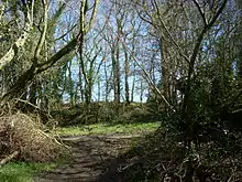 The outlier extends across fields but is more clearly marked towards the north end within Crates Wood where it reaches a maximum height of 2.8 metres (9.2 ft), with a 0.4-metre (1.3 ft) deep ditch on its west side. The bank is up to 6 metres (20 ft) wide and the ditch measures 3 to 5 metres (9.8 to 16.4 ft) wide. On its east side the earthwork's scarp stands 1.8 metres (5.9 ft) high and forms a field boundary. At the south end where it crosses fields the bank is much reduced by ploughing, with a maximum height of 0.6 metres (2.0 ft) and traces of a ploughed-out ditch.[5]