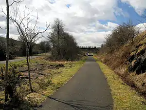 This station never opened.[1] The proposed location of the station was a short distance north east of Castle Semple Loch, where a widening on the former railway line is still visible. A platform did exist here, used by the workers of the nearby Castle Semple Estate.[1] Had the station opened to the general public, it would likely have been called Howwood or St Bryde's (after nearby St Bryde's House and burn).[1] The trackbed is now part of National Cycle Route 7.