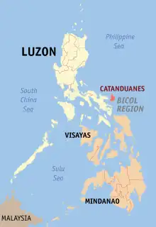 Catanduanes's at-large congressional district, also known as Catanduanes's lone district, is the sole congressional district of the Philippines in the province of Catanduanes. Catanduanes has been represented in the country's various national legislatures since 1898.[3] Since 1946 when it was reorganized as an independent province separate from Albay, Catanduanes has been entitled to one member in the House of Representatives of the Philippines, elected provincewide at-large, except for the period under the Fourth Philippine Republic between 1978 and 1984 when its representation was absorbed by the regional at-large assembly district of Region V.[4]