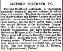 In 1923, a merger was proposed with Charlton Athletic which would include keeping Catford Southend's colours and name. In response, Charlton supporters formed a new team, Old Charlton. However, the merger was never completed and Old Charlton applied for Catford's place in the London league, which they were granted for the 23/24 season. The Old Charlton team were former Charlton players and Catford Southend players.[3]