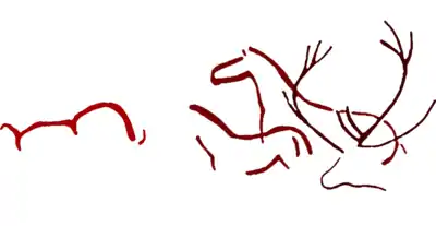 • Claviform signs: The signs called 'claviform' (key-shaped) are fairly abundant, specially in gallery B and in Room XI, but are doubtful if not indeed non-existent in Gallery A. Those of Room XI are the most characteristic and may be associated with horses. One of these can be considered as what Leroi-Gourhan calls a 'coupled sign',[15] made by uniting in the same idiomorph a line or bar (masculine) with a key-shape (feminine). The typology and chronology of these signs is very ample.