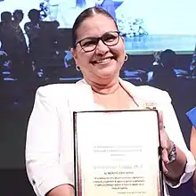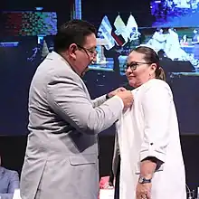 Cecilia Paredes Verduga receives the award from Virgilio Saquicela in Guayaquil, 9 Oct 2022