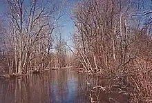 Upper Cedar Creek originated as an ice-marginal channel at the western edge of the Erie Lobe of the Wisconsin Glacier and formed a single stream with the southwest-flowing Eel River which connected to the Wabash River. Lower Cedar Creek was a tributary of the ancestral Eel, carrying glacial meltwater under the ice through a tunnel valley known today as Cedar Creek Canyon.[3] Blockage of the Eel's channel by outwash from the canyon and a decline in the volume of meltwater caused lower Cedar Creek to reverse its flow. In so doing, it captured the flow of the upper Eel, a classic example of stream piracy that shifted Cedar Creek's drainage (about 175,000 acres) from the Eel-Wabash system to that of the St. Joseph-Maumee.[4]