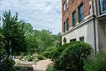 The building had a 335-foot (102 m) frontage on Cedar Glen Parkway, a 200-foot (61 m) frontage on Ambleside Drive.[33] The building's access road was set back 30 feet (9.1 m) from Cedar Glen Parkway, and the structure's east wall 20 feet (6.1 m) from Ambleside. Ample vacant land at the rear of the building provided privacy. The first floor of the Georgian Revival-style[37][39] building's exterior was clad in Indiana limestone, with the upper floors consisting of exposed brick with limestone trim at the corners[35] and around the doorways. The windows were trimmed with stone.[37] The building frame was steel, with walls, floors, and the roof of reinforced concrete.[36] The cornice was topped by a balustrade consisting of terra cotta balusters and a stone railing. Stone urns rested atop the balustrade.[37] The structure's exterior and interior masonry walls were certified by the Cleveland Clay League as using locally sourced materials, fireproof, and attractive.[40] The E-shaped building had a garden forecourt 75 feet (23 m) deep and 100 feet (30 m) long. The apartment complex itself consisted of a six-story central tower equipped with an elevator, and two four-story walk-up wings (e.g., equipped with stairs but no elevator).[35] Each wing, each connection, and the central tower all had their own entrances.[37] The building had an underground[33] 40-car garage[36] with internal staircases (so patrons did not have to exit the garage to reach the interior of the building).[35]