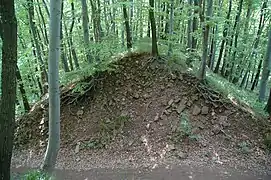 In front of the castle, at the site of a former Bronze Age settlement, the graveyard of the Iron Age settlement was discovered, which is still recognizable under the trees of the forest with its stone-laid tombs and the cremation rituals with stone circles surrounding them. The side easiest to approach of the fortress was protected by the highest rampart sections.[4]