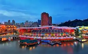 At Church Street is the Yueh Hai Ching Temple, one of the oldest Taoist temples, having been built in 1852 (however, an older wood-and-attap shrine was built on Philip Street 1826).[9][10] This temple was established by a group of Teochew settlers from Guangzhou in China when they dedicated a shrine to Tian Hou Sheng Mu. This temple faced the sea and was therefore a place where newly arrived Chinese immigrants (sailors and travellers) came to offer their respect to the Goddess for their safe voyage across the seas. The renovation to the temple was undertaken by the Ngee Ann Kongsi, which was formed by a group of immigrants from the Teochew community. This temple served as a meeting place for the people of the Teochew community in the late 19th century when the Teochews became the second largest Chinese Dialect group in Singapore. The temple was honoured with a bian e, an imperial plaque from Emperor Guangxu of the Qing Dynasty in 1907.[9] In 1996 it was gazetted as a national monument and it underwent repairs and restoration works.[10] The background contrast between the old temples and the new modern buildings indicate the juxtaposition and coexistence of new and old. The temple has a cover structure composed of models depicting the lives of Chinese villagers. Guangxu also presented the temple with a signboard that is still displayed in the temple today.[11]