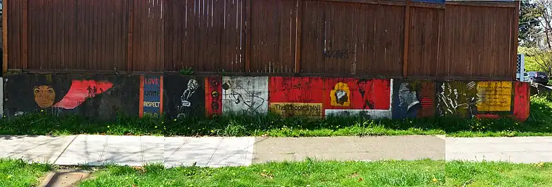 The People's Wall, painted in 1970 by Dion Henderson, is the last remnant of the Second Headquarters of the Seattle Black Panther Party. Photographed 2023.