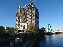 In 2020, a large real estate was unveiled on the western tip of the park, "River Tower".[6] Located along the river, in the vicinity of Łuczniczka and Torbyd halls, it consists of a pair of 64 metres (210 ft)-high and 20-floors towers. The twin buildings, encompassing 128 apartments, are the tallest residential edifice in Bydgoszcz and houses also a restaurant, a gym, a playing ground for children and a mini-marina.[7]