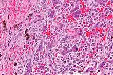 Micrograph of a central giant cell granuloma showing the characteristic giant cells with surrounding cells that have nuclei that are dissimilar to those in the giant cells. H&E stain.