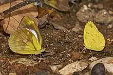Cepora nadina and Eurema blanda mud-puddling from the dry stream bed at Aralam Wildlife Sanctuary, Kerala, India.