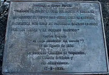 When the second survey voyage of HMS Beagle arrived at Valparaiso on 23 July 1834, Charles Darwin took residence ashore to explore the area. On 14 August he obtained horses and set off with a companion "on a geological excursion" to the base of the Andes. They reached the Hacienda de San Isidro, sited at the foot of Cerro La Campana, and on the morning of 16 August after being given a guide and fresh horses they began their ascent. In his notes on the vegetation seen on the way up, including a sort of bamboo, he described the process by which sap resembling honey was obtained from the palms. In the evening they camped at a spring named the Agua del Guanaco, then on the next morning climbed the "rough mass" of fragmented greenstone to the summit, where they spent the day. A plaque on the path to the top commemorates Darwin's ascent. Darwin enjoyed the day thoroughly, writing "Chile & its boundaries the Andes & the Pacifick were seen as in a Map. .... Who can avoid admiring the wonderful force which has upheaved these mountains, & even more so the countless ages which it must have required to have broken through, removed & levelled whole masses of them?" All over the mountain he had seen attempts at gold mining, and even on the summit a small pit had been excavated. After another evening talking round their camp fire, they descended on the following day by a different route to the Hacienda, and continued on to Quillota on their way to Santiago.[4]
