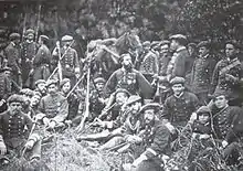 Upon access Sanz declined an offer to be promoted to a comandante; he was assigned to the troops commanded by general Nicolas Ollo and operating in central Navarre. It is not clear what unit he was heading during the 1873 campaign, first taking part in victorious battles of Allo and Dicastillo, then taking Estella and finally laying siege to Viana and Lumbier.[29] Gaining his comandante stripes on the battlefield, later in the year he was entrusted with organization of 9. Batallón de Navarra, the unit he then led in combat.[30] In June 1874 he organized a daring attempt to capture Lumbier, an episode which almost cost him life when cut off from his troops, in an isolated house and with personal staff only he fought off enemy soldiers.[31] In the second half of 1874 Sanz led the 9. Battalion at Rocafuerte, Abárzuza and Sangüesa,[32] recognized for both serenity and valor when under fire. During fighting at Santa Margarita heights he personally led a company in a head-on charge and had his horse shot; he was afterwards promoted to teniente coronel.[33]