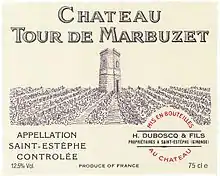 Château Tour de Marbuzet is a Bordeaux wine estate in the appellation St.-Estèphe. It was originally part of the great Château MacCarthy estate, divided up and sold in 1854 to Mr Laurent Mathé, a renowned viticulturist of his time. In 1981, it was bought by Henri Duboscq, owner of Château Haut-Marbuzet.[1]