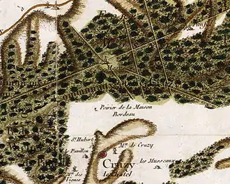 It lies on the edge of a large plateau of farmland that was once covered with forests. The 18th-century Cassini map shows the château surrounded by a vast forest, in a clearing at the intersection of five forest paths. These paths allowed for ease of logging and hunting, and also created a view of the château. The château has three predictable streams of water, providing water to the premises.