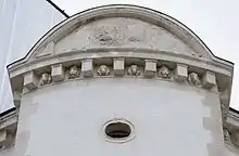 The ashlar roof base was made up of a cornice with supporting corbels, the design of which were of alternating dog heads and lion heads, reflecting a hunting theme. Photographs from 1942, show that three dogs' heads were still in place at that time. This decoration has subsequently been reconstructed on the northeast and northwest facades. With the exception of heads, the facades appear very simple, which was uncommon at the time. However, their layout is well organized and more complex than it first appears. For example, there was a gradation of materials used; rustic stone for nymphée, smooth cut stones for the roof base, plaster cornices and protruding, stepped cornices floors.