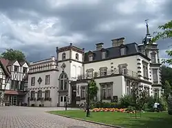 The present building was built in 1891 by the entrepreneur Léonard Heydt (1829–1901), who also served as the mayor of Ostwald from 1861 until his death.[1] It re-employs elements of a previous castle from the early 17th century, which had probably replaced an even earlier castle (the first mention of a castle in Ostwald dates from the year 1226).[2] The Renaissance elements of the 17th-century castle were integrated into the Neo-Renaissance designs commissioned by Heydt, who called his property by the German name of Schloss Inselburg (literally: "Castle Fortress-on-the-Island"), since Alsace was part of the German Empire in 1891.[1][3] The French name of the castle translates as "Castle of the Island", since the grounds are indeed surrounded by a small lateral arm of the river Ill.