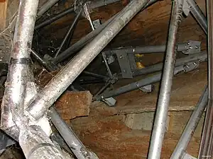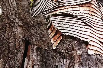 Today, a number of measures are necessary in order to counter problems caused by the age of the tree: poles shore up the weight of some branches, and wooden shingles have been used to cover areas of the tree that have lost their bark; still, part of its trunk is already dead.