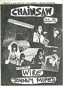 Chainsaw, a punk zine edited by "Charlie Chainsaw" was published in suburban Croydon in 1977 and ran to fourteen issues before ceasing publication in 1984. A hand-lettered 'n' became a stylised trademark in articles after the 'n' key broke on the editor's typewriter. In addition to a free flexi disc promoting two or three up-and-coming punk bands, 1980s issues featured cartoon strips and two innovative colour covers by Michael J. Weller. 1970s issues featured the cartoon strip 'Hitler's Kids', authored by Andrew Marr using punk nom-de-plume "Willie D" at the beginning of his successful journalistic career.[1] Charlie Chainsaw formed the band Rancid Hell Spawn when the punk zine discontinued.
